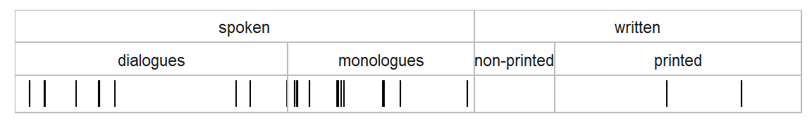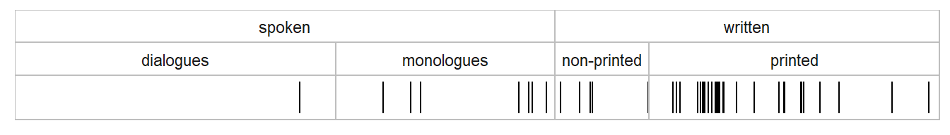 If we are working with a corpus that consists of different text categories (such as registers, genres, etc.), it makes sense to enrich dispersion plots with information about the structure of the corpus. In this blog post, we look at one way of doing so, which I will refer to as a structured dispersion plot. It strings together all text files in the corpus and locates the occurrences of an item throughout the entire corpus. The structure of the text files is reflected through one or several annotation layers above the dispersion plot; this way, we can see in which sub-corpus a particular instance occurred.