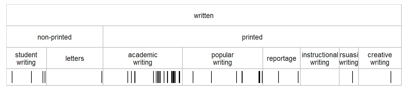 Figure 2: Structured dispersion plot showing the distribution of methods in the written part of ICE-GB.