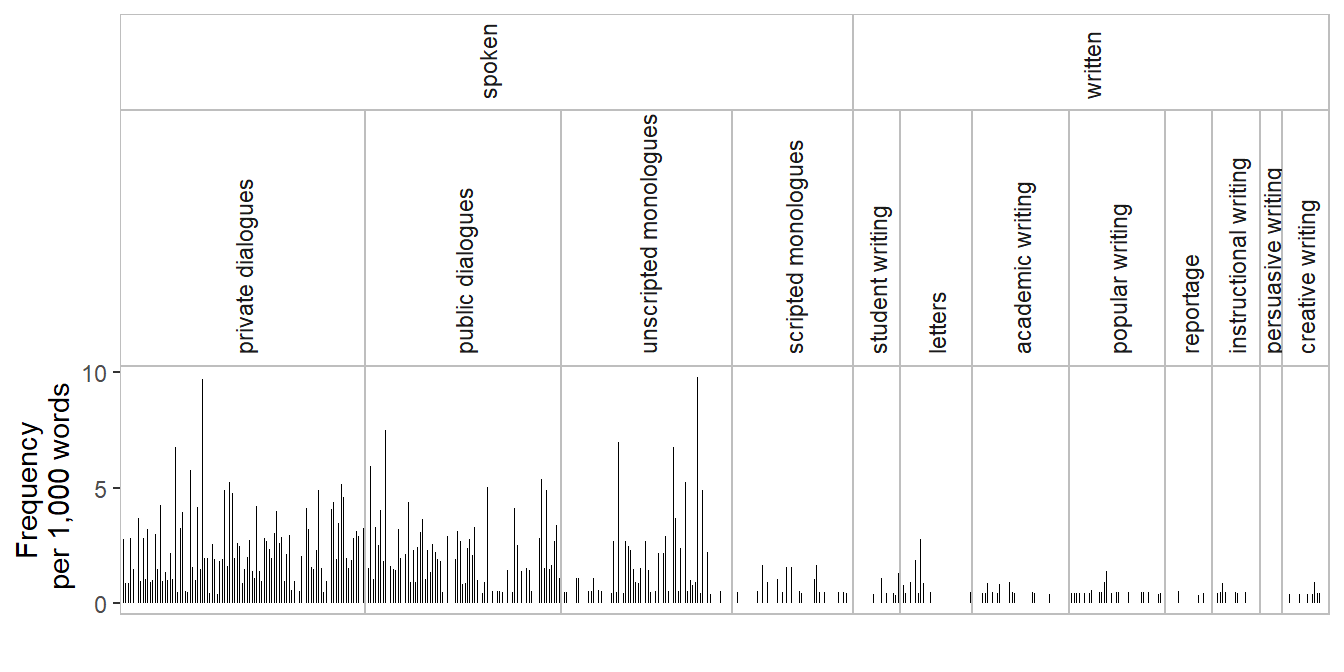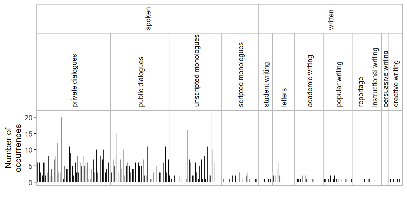 ice_actually |>ggplot(aes(x = text_file, # text_file as x-variabley = n_tokens)) +# frequency of item as y-variablegeom_segment(aes(xend = text_file), # draw spikes for each text fileyend =0, # spike starts at 0linewidth = .2) +# draw thin linesfacet_nested( # nested facets with the {ggh4x} package: . ~ mode + macro_genre_nice, # macro genre facets nested within mode scales ="free", # allow x-scale to vary across facetsspace ="free_x", # facet width proportional to # of textsstrip =strip_nested( # allow height of facet labels abovesize ="variable")) +# graph to vary theme_bw() +# specify theme_bw() as basistheme_spike_graph() +# custom theme for spike graphscale_x_discrete(expand =c(0,0)) +# avoid left/right padding in facets ylab("Number of\noccurrences") +# add y-axis titlexlab("") +# no title on x-axistheme( # strip.text.x.top =element_text( # format facet labelsangle =90, hjust =0)) # rotate by 90 degrees and left-align