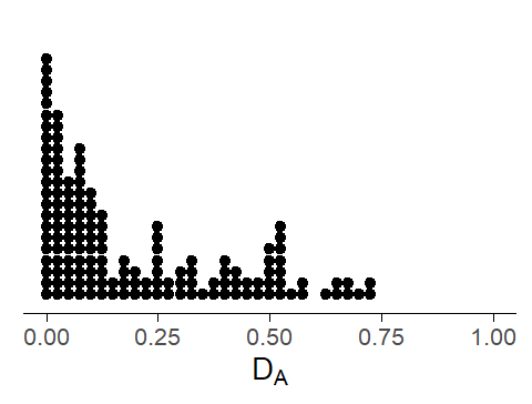 As a second example, let us compute the dispersion measure DA(Burch, Egbert, and Biber 2017) for the 150 items, this time in the Spoken BNC1994 (four items from the list do not appear in the Spoken BNC1994, so we are looking at only 146 items):