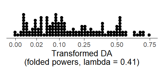 We can alleviate the skew with a folded power transformations, setting \(\lambda = 0.41\). Recall that this gives us a close approximation to the arcsine-square-root (angular) transformation: