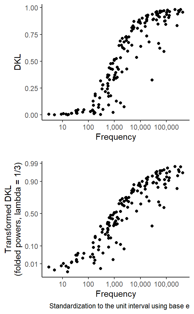 DKL_spokenBNC2014 <-disp_DKL_tdm(tdm = biber150_spokenBNC2014, row_partsize ="first",standardization ="base_e",print_score =FALSE,verbose =FALSE)p1 <- DKL_spokenBNC2014 |>ggplot(aes(x = frequency, y = DKL)) +geom_point() +ylab("\nDKL") +xlab("Frequency") +scale_x_log10(labels = scales::comma) +theme_classic() +labs(caption =" ")p2 <- DKL_spokenBNC2014 |>ggplot(aes(x = frequency, y = DKL)) +geom_point() +ylab("Transformed DKL\n(folded powers, lambda = 1/3)") +xlab("Frequency") +scale_x_log10(labels = scales::comma) +theme_classic() +scale_y_fpower(lambda =1/3, breaks =c(0, .01, .1, .5, .9, .99)) +labs(caption ="Standardization to the unit interval using base e")cowplot::plot_grid(p1, p2, nrow =2)