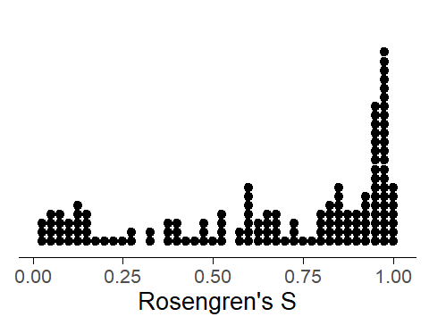 The {tlda} package also offers the functions scale_x_fpower() and scale_y_fpower(), which can be integrated into {ggplot2} code to plot data on a transformed scale (while keeping the original units as tick mark labels). For illustration, we consider a set of dispersion scores: Specifically, Rosengren’s S(Rosengren 1971) for the dispersion of 150 selected items (Biber et al. 2016) across speakers in the Spoken BNC2014. In this analysis, then, the speakers are the corpus parts. The data are available as the dataset biber150_spokenBNC2014 in the {tlda} package. We start by calculating Rosengren’s S for the 150 items (since two items from the list do not appear in the Spoken BNC2014, we are actually looking at only 148 items):