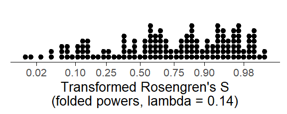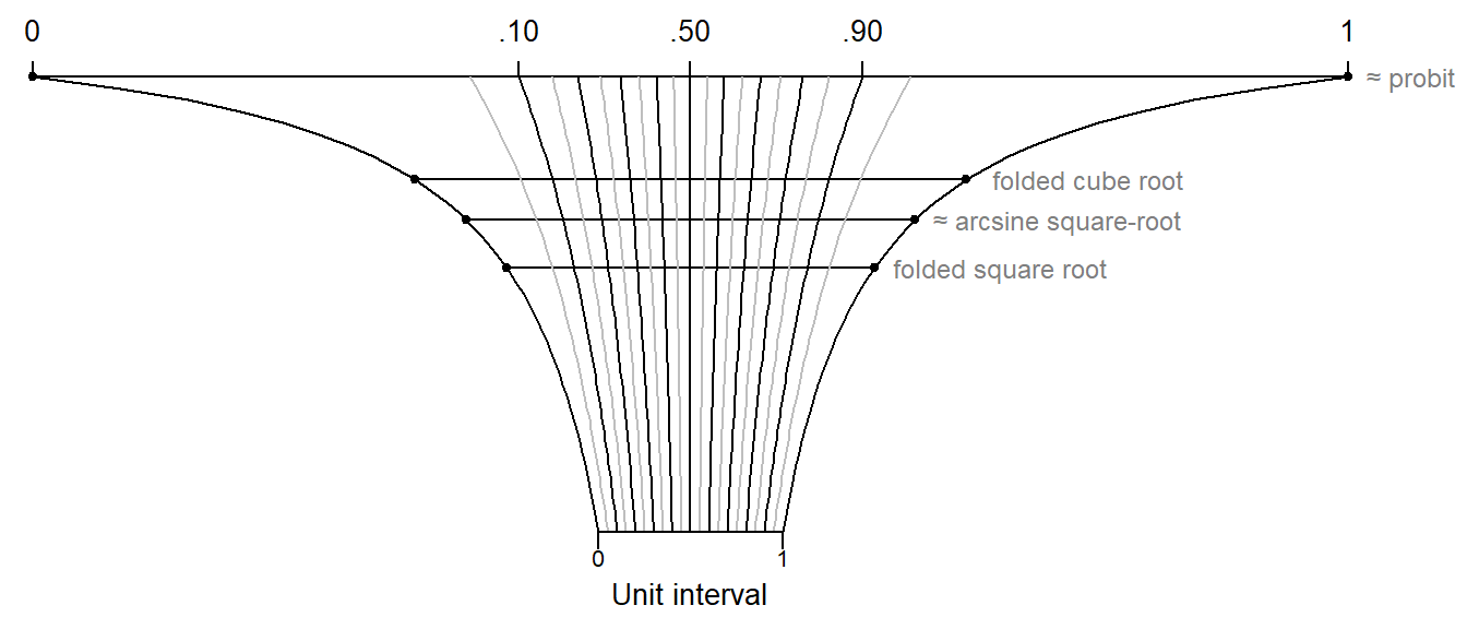 There are two reasons why folded power transformations are attractive when working with scores in the unit interval. First, with the exception of the logit transformation, they can handle the endpoints (0 and 1). Further, they give the user flexibility in the choice of \(\lambda\), with (approximations to) various special cases along the continuum from 0 to 1.