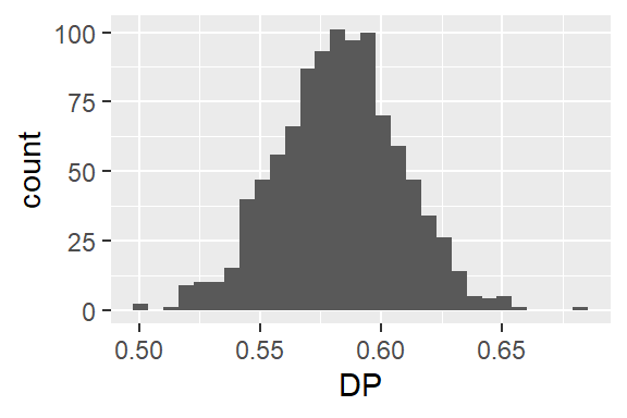We will draw 500 bootstrap samples, with each being drawn randomly with replacement from the pool of 668 speakers. Recall the each bootstrap sample consists of 668 “speakers”, where a considerable number of individuals will appear (i) multiple times or (ii) not at all in the bootstrap sample. The figure below shows the distribution of the 500 bootstrap estimates for DP.